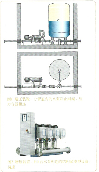當沒法做到飲用水無塔供水設備的一切正常供水管道網壓力時,為了向(高樓大廈或高地形地域里的)接收器供電,就務必提升出水壓力。根據在與主管相接的主抓道里區安裝一臺或幾臺增壓泵來提升出水出水壓力。