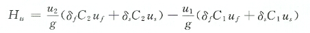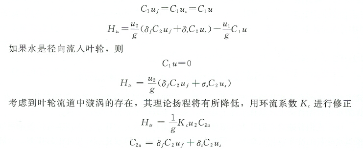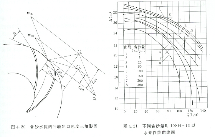 水泵套弄含沙水時,因為細沙固態(tài)顆粒物遭受的向心力超過水體點的向心力.故軸向速度C2rs超過水體點的徑向速度C2rf,從而造成細沙固態(tài)顆粒物的切向速度C2us低于水體點的切向速度Cz2uf見圖4.20),因而,離心葉輪出入口含沙水的均值徑向分速率C2us降低,其基礎理論揚程低于冷水時的基礎理論揚程值。