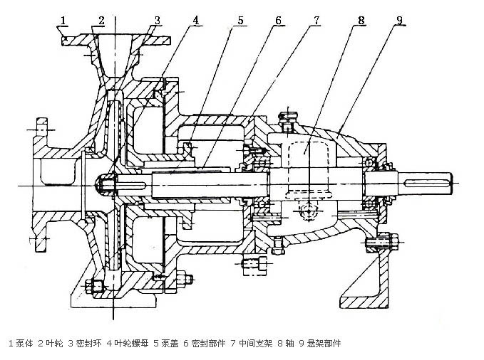 IH化工泵主要是由泵殼、葉輪、泵蓋、軸、聯軸器、密封圈、葉輪螺帽、正中間支撐架、懸掛系統構件等構成,如圖所示6-21所顯示。該化工泵選用后開關門構造,設計方案有延長連軸器,維修時不用拆裝與泵殼聯接的進、出入口管道,也不用拆裝電機,只需拆下來延長連軸器的正中間聯接件,就可以拆卸泵的電機轉子構件開展維修,使檢修工作中十分便捷。
