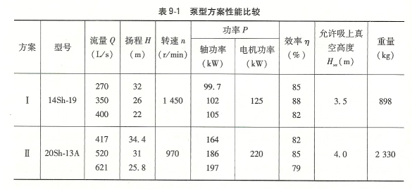 根據(jù)污水處理廠設(shè)計方案總流量1.6 m3/s和設(shè)計方案水泵揚(yáng)程30.36 m,決策采用雙吸離心水泵。查離心水泵資料中的離心水泵特性表得14 Sh一19與20Sh-13A二種泵型均符合規(guī)定,做為計劃方案開展較為,它們的特性如表9一l所顯示。