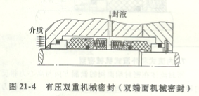 有壓雙向機械密封(雙端面機械密封)大部分用以易燃性、易燃易爆、有害、含顆粒物及潤濕性差的物質,一般應用時要配置密封輔助系統軟件,即在兩端面間的密封腔中通快遞入防護液體,進而改進機械密封的潤化和制冷標準,如圖所示雙端面機械密封結構圖21—4所顯示。